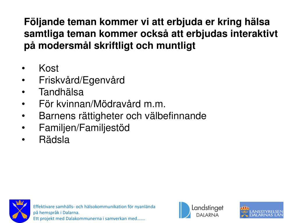 Följande teman kommer vi att erbjuda er kring hälsa samtliga teman kommer också att erbjudas interaktivt på modersmål skriftligt och muntligt • Kost • Friskvård/Egenvård • Tandhälsa • För kvinnan/Mödravård m.m. • Barnens rättigheter och välbefinnande • Familjen/Familjestöd • Rädsla Effektivare samhälls- och hälsokommunikation för nyanlända på hemspråk i Dalarna. Ett projekt med Dalakommunerna i samverkan med…….