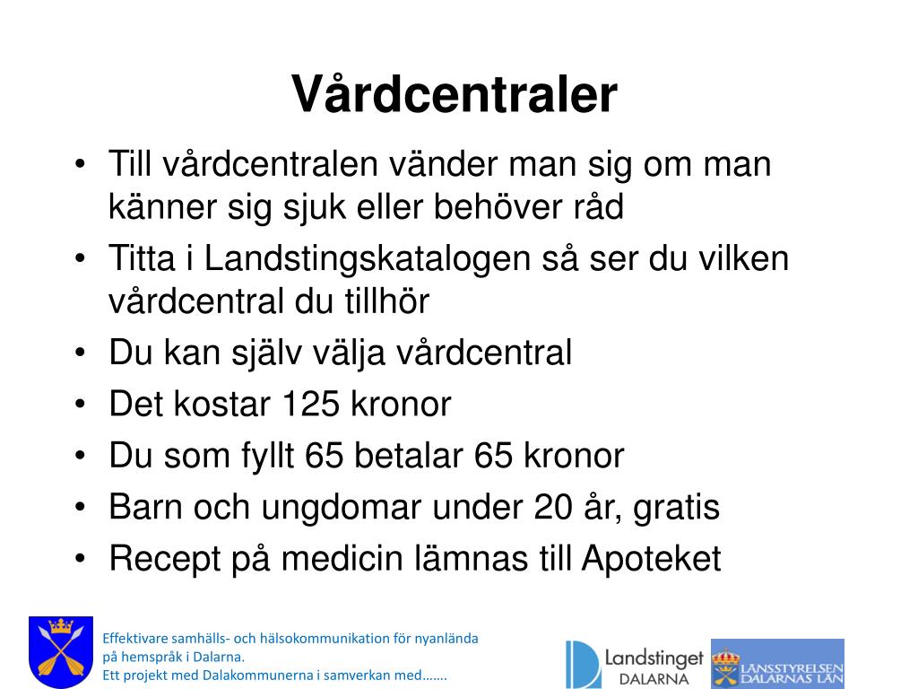Vårdcentraler • Till vårdcentralen vänder man sig om man känner sig sjuk eller behöver råd • Titta i Landstingskatalogen så ser du vilken vårdcentral du tillhör • Du kan själv välja vårdcentral • Det kostar 125 kronor • Du som fyllt 65 betalar 65 kronor • Barn och ungdomar under 20 år, gratis • Recept på medicin lämnas till Apoteket Effektivare samhälls- och hälsokommunikation för nyanlända på hemspråk i Dalarna. Ett projekt med Dalakommunerna i samverkan med…….