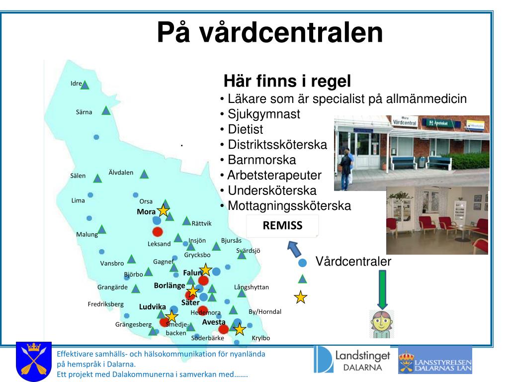 På vårdcentralen • Här finns i regel • Läkare som är specialist på allmänmedicin • Sjukgymnast • Dietist • Distriktssköterska • Barnmorska • Arbetsterapeuter • Undersköterska • Mottagningssköterska Idre Särna . Älvdalen Sälen Lima Orsa Mora REMISS Rättvik Malung Insjön Bjursås Leksand Svärdsjö Grycksbo Vårdcentraler Gagnef Vansbro Falun Björbo Borlänge Grangärde Långshyttan Säter Fredriksberg Ludvika By/Horndal Hedemora Avesta Grängesberg Smedje- backen Söderbärke Krylbo Effektivare samhälls- och hälsokommunikation för nyanlända på hemspråk i Dalarna. Ett projekt med Dalakommunerna i samverkan med…….