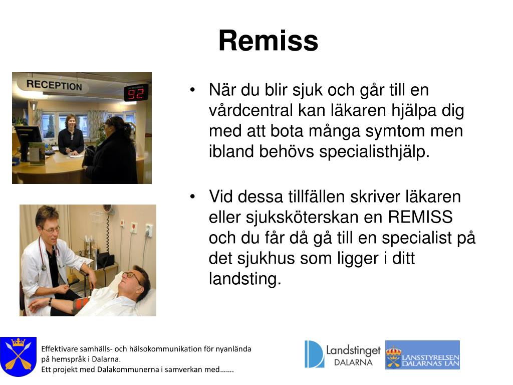 Remiss • När du blir sjuk och går till en vårdcentral kan läkaren hjälpa dig med att bota många symtom men ibland behövs specialisthjälp. • Vid dessa tillfällen skriver läkaren eller sjuksköterskan en REMISS och du får då gå till en specialist på det sjukhus som ligger i ditt landsting. Effektivare samhälls- och hälsokommunikation för nyanlända på hemspråk i Dalarna. Ett projekt med Dalakommunerna i samverkan med…….