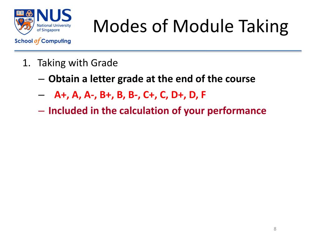 Modes of Module Taking • Taking with Grade • Obtain a letter grade at the end of the course • A+, A, A-, B+, B, B-, C+, C, D+, D, F • Included in the calculation of your performance