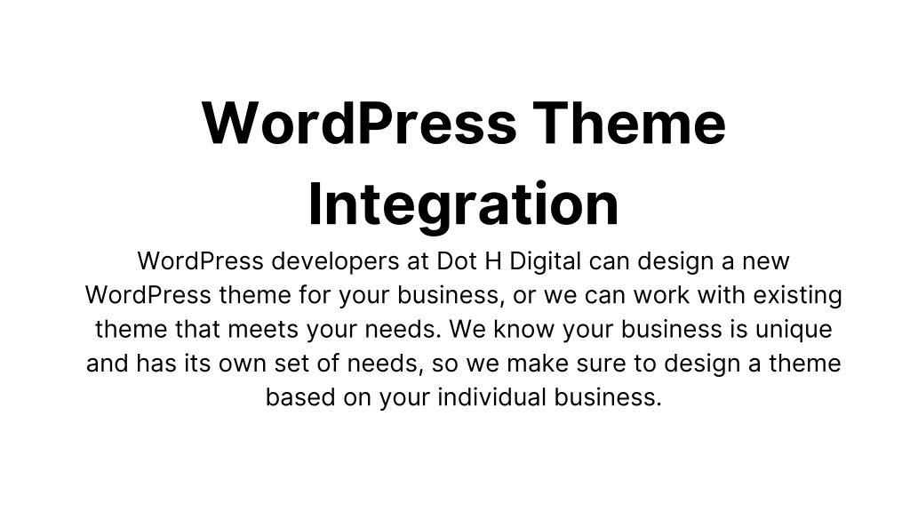 WordPress Theme Integration WordPress developers at Dot H Digital can design a new WordPress theme for your business, or we can work with existing theme that meets your needs. We know your business is unique and has its own set of needs, so we make sure to design a theme based on your individual business.
