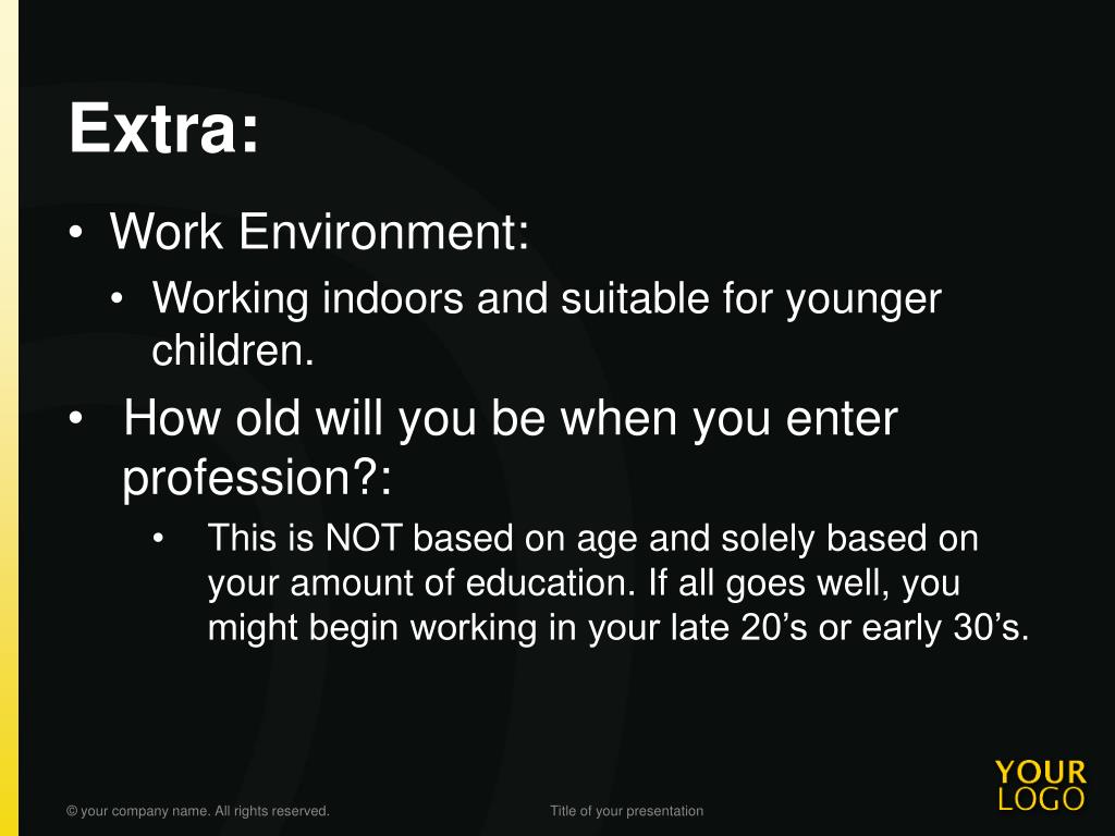 Extra: • Work Environment: • Working indoors and suitable for younger children. • How old will you be when you enter profession?: • This is NOT based on age and solely based on your amount of education. If all goes well, you might begin working in your late 20’s or early 30’s. Title of your presentation