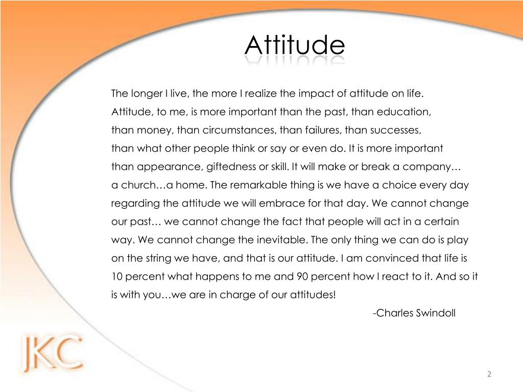 Attitude The longer I live, the more I realize the impact of attitude on life. Attitude, to me, is more important than the past, than education, than money, than circumstances, than failures, than successes, than what other people think or say or even do. It is more importantthan appearance, giftedness or skill. It will make or break a company…a church…a home. The remarkable thing is we have a choice every day regarding the attitude we will embrace for that day. We cannot change our past… we cannot change the fact that people will act in a certain way. We cannot change the inevitable. The only thing we can do is play on the string we have, and that is our attitude. I am convinced that life is 10 percent what happens to me and 90 percent how I react to it. And so it is with you…we are in charge of our attitudes! -Charles Swindoll