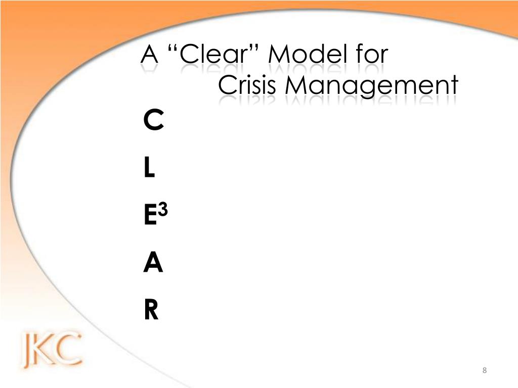 A “Clear” Model for Crisis Management C L E3 A R Calm Listen E3empathy, Agree to a solution Respond and follow up explain, expectation