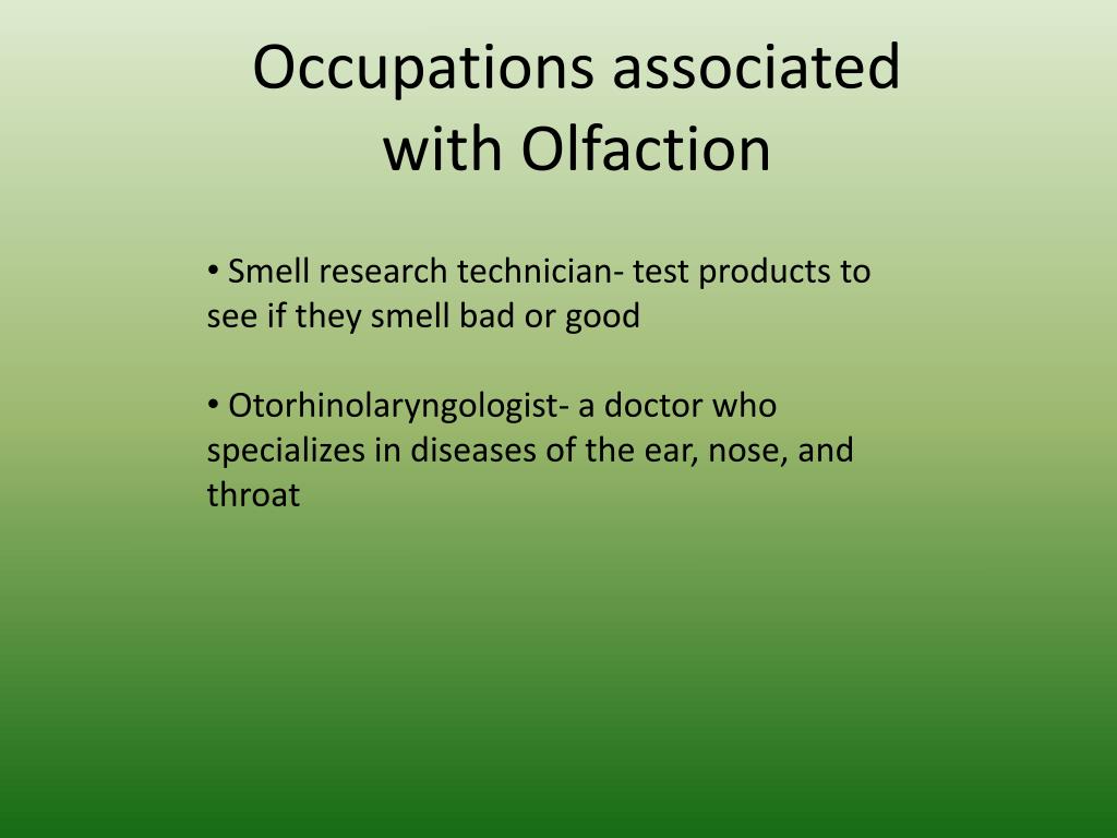Occupations associated with Olfaction • Smell research technician- test products to see if they smell bad or good • Otorhinolaryngologist- a doctor who specializes in diseases of the ear, nose, and throat