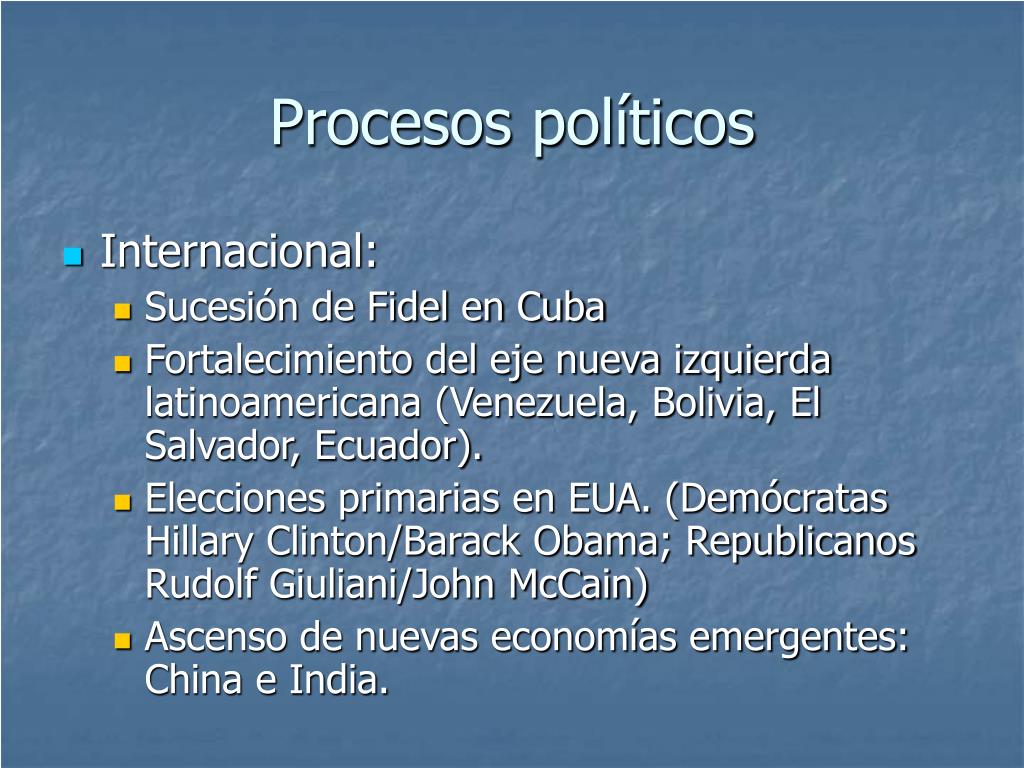 Procesos políticos • Internacional: • Sucesión de Fidel en Cuba • Fortalecimiento del eje nueva izquierda latinoamericana (Venezuela, Bolivia, El Salvador, Ecuador). • Elecciones primarias en EUA. (Demócratas Hillary Clinton/Barack Obama; Republicanos Rudolf Giuliani/John McCain) • Ascenso de nuevas economías emergentes: China e India.