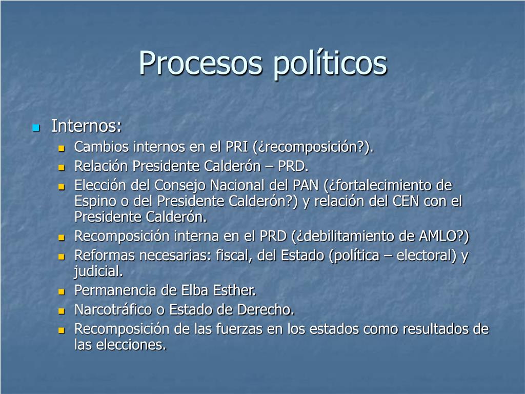 Procesos políticos • Internos: • Cambios internos en el PRI (¿recomposición?). • Relación Presidente Calderón – PRD. • Elección del Consejo Nacional del PAN (¿fortalecimiento de Espino o del Presidente Calderón?) y relación del CEN con el Presidente Calderón. • Recomposición interna en el PRD (¿debilitamiento de AMLO?) • Reformas necesarias: fiscal, del Estado (política – electoral) y judicial. • Permanencia de Elba Esther. • Narcotráfico o Estado de Derecho. • Recomposición de las fuerzas en los estados como resultados de las elecciones.