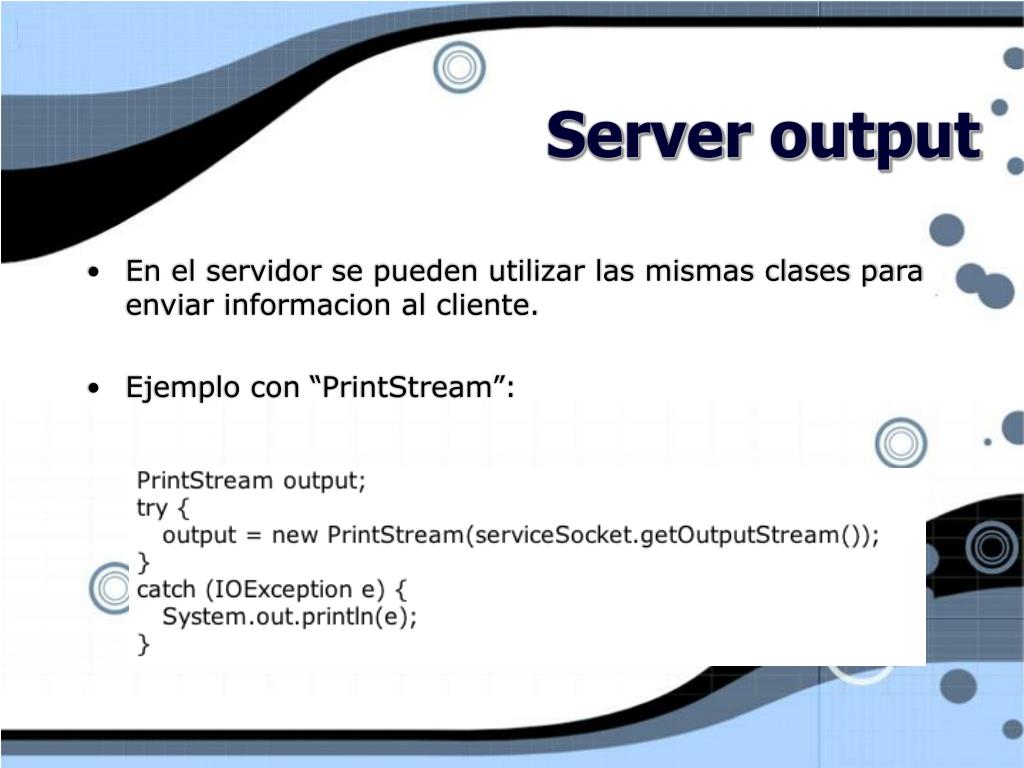 Server output • En el servidor se pueden utilizar las mismas clases para enviar informacion al cliente. • Ejemplo con “PrintStream”: