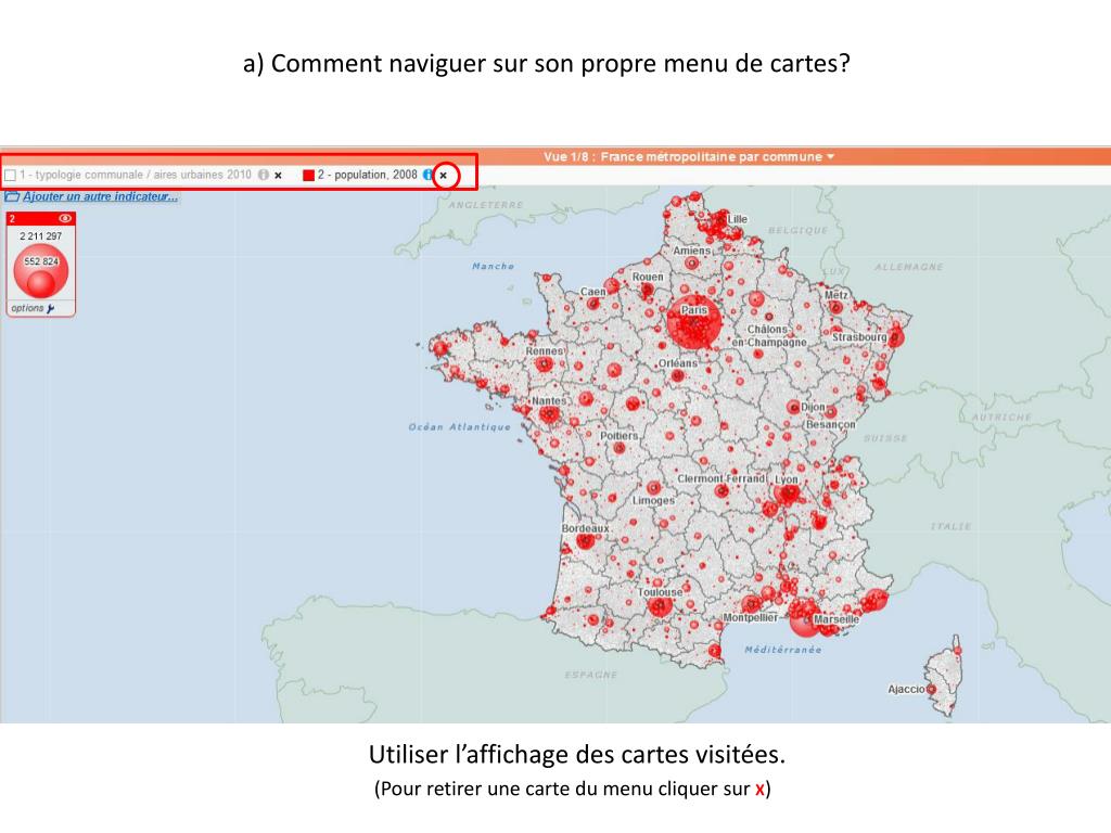 a ) Comment naviguer sur son propre menu de cartes?. Utiliser l’affichage des cartes visitées. (Pour retirer une carte du menu cliquer sur X ). b ) Comment masquer ou afficher la superposition de deux cartes?. Utiliser l’icône en haut et à droite de la légende.