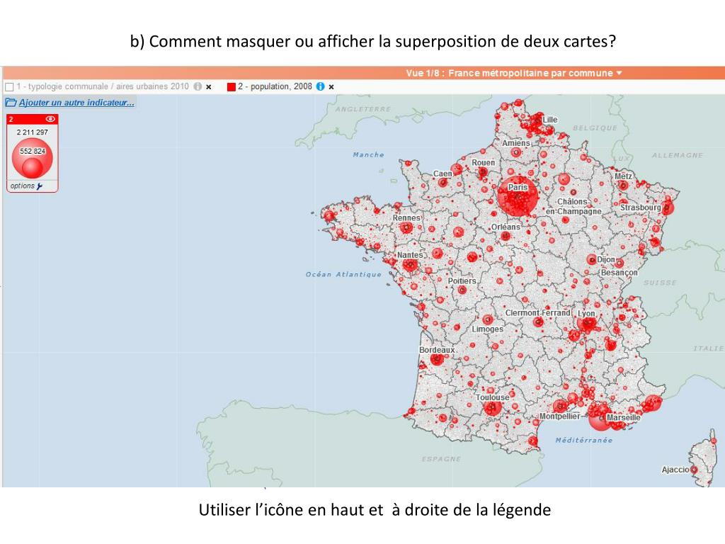 b) Comment masquer ou afficher la superposition de deux cartes? Utiliser l’icône en haut et à droite de la légende