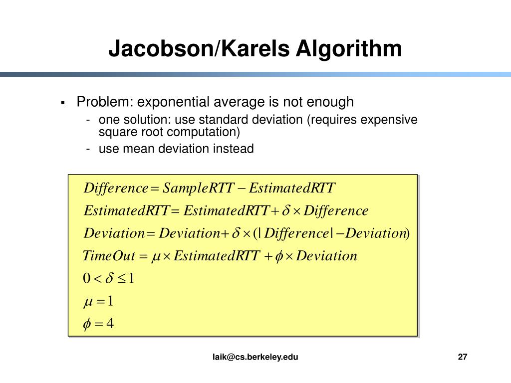 Jacobson/Karels Algorithm • Problem: exponential average is not enough • one solution: use standard deviation (requires expensive square root computation) • use mean deviation instead laik@cs.berkeley.edu