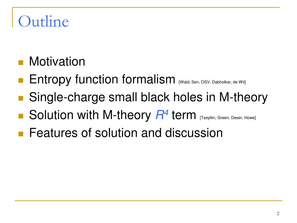 Outline • Motivation • Entropy function formalism [Wald, Sen, OSV, Dabholkar, de Wit] • Single-charge small black holes in M-theory • Solution with M-theory R4 term [Tseytlin, Green, Deser, Howe] • Features of solution and discussion