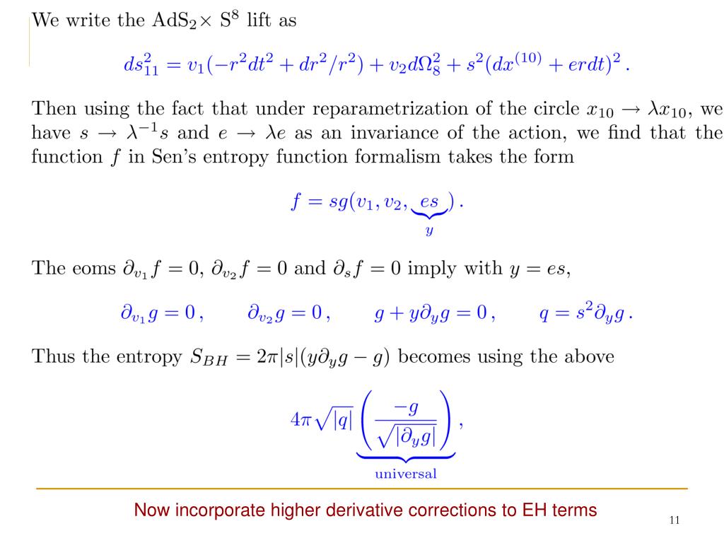 Entropy function—Sen’s derivation • Following Sen, definition of extremal black holes in higher derivative theory: Black hole with near horizon geometryAdS2£ SD. • Start with general gauge and coordinate invariant theory with metric g, Abelian gauge fields Ai and neutral scalar fields s. • Assume background fields to respect the SO(2,1)£ SO(D+1) symmetry of AdS2£ SD.