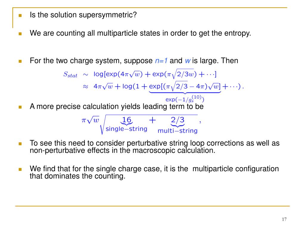 Is the solution supersymmetric? • We are counting all multiparticle states in order to get the entropy. • For the two charge system, suppose n=1 and w is large. Then • A more precise calculation yields leading term to be • To see this need to consider perturbative string loop corrections as well as non-perturbative effects in the macroscopic calculation. • We find that for the single charge case, it is the multiparticle configuration that dominates the counting.
