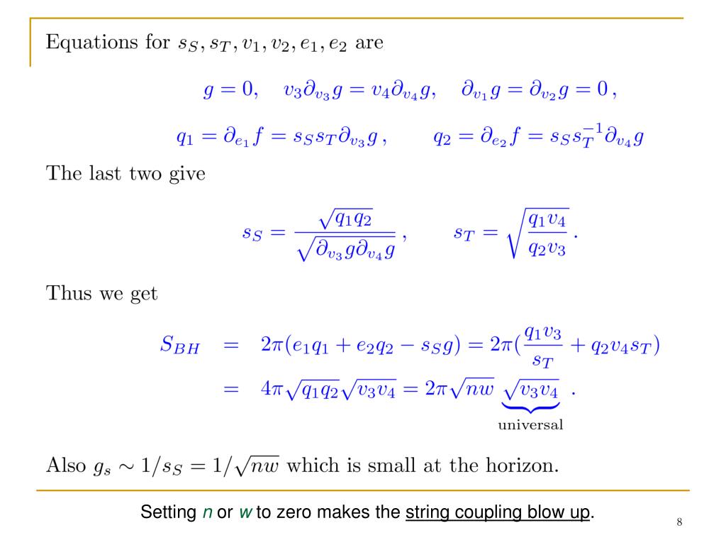 Features of solution and discussion • Satisfies v1=y2. Sets two of the three equations to be equal to one another and hence we need to solve only two equations for two unknowns. Presumably can be done algebraically. • v1=y2 implies probe D0-brane experiences vanishing force and DM RABCD=0 (note that this is not required in the 11-d lift and is only required in 10-d geometry). • The leading entropy is still proportional to area. • Our n.h. geometry AdS2£ S8 is a new solution not seen in SUGRA. • The 11-d lift is locally AdS3£ S8 with a 1-d null boundary. • Ratio EH/R4=-1/3. Ratio in 2 charge case for Sen EH/R2=-1. Is this rationality a coincidence?