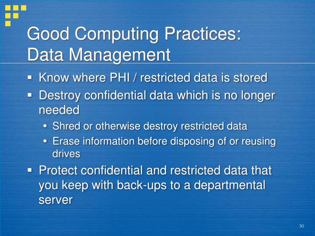 Good Computing Practices:Data Management Know where PHI / restricted data is stored Destroy confidential data which is no longer needed Shred or otherwise destroy restricted data Erase information before disposing of or reusing drives Protect confidential and restricted data that you keep with back-ups to a departmental server