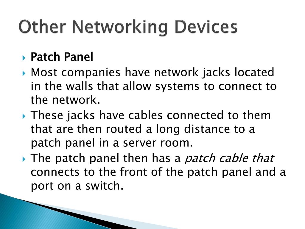 Other Networking Devices • Patch Panel • Most companies have network jacks located in the walls that allow systems to connect to the network. • These jacks have cables connected to them that are then routed a long distance to a patch panel in a server room. • The patch panel then has a patch cable that connects to the front of the patch panel and a port on a switch.