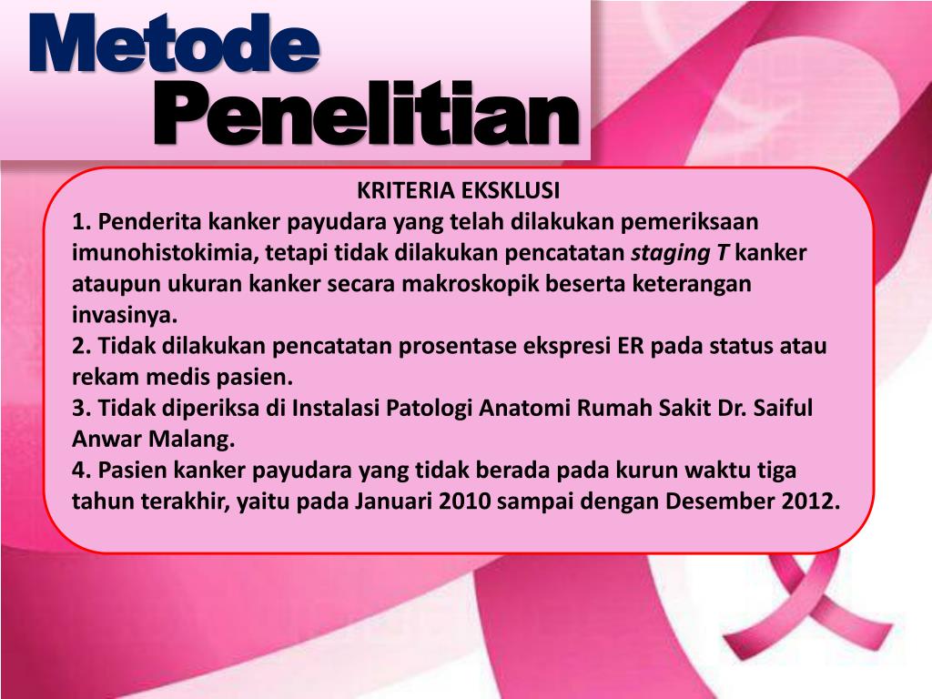 Metode Penelitian • KRITERIA EKSKLUSI • 1. Penderitakankerpayudara yang telahdilakukanpemeriksaanimunohistokimia, tetapitidakdilakukanpencatatanstaging Tkankerataupunukurankankersecaramakroskopikbesertaketeranganinvasinya. • 2. Tidakdilakukanpencatatanprosentaseekspresi ER pada status ataurekammedispasien. • 3. TidakdiperiksadiInstalasiPatologiAnatomiRumahSakit Dr. Saiful Anwar Malang. • 4. Pasienkankerpayudara yang tidakberadapadakurunwaktutigatahunterakhir, yaitupadaJanuari 2010 sampaidenganDesember 2012.