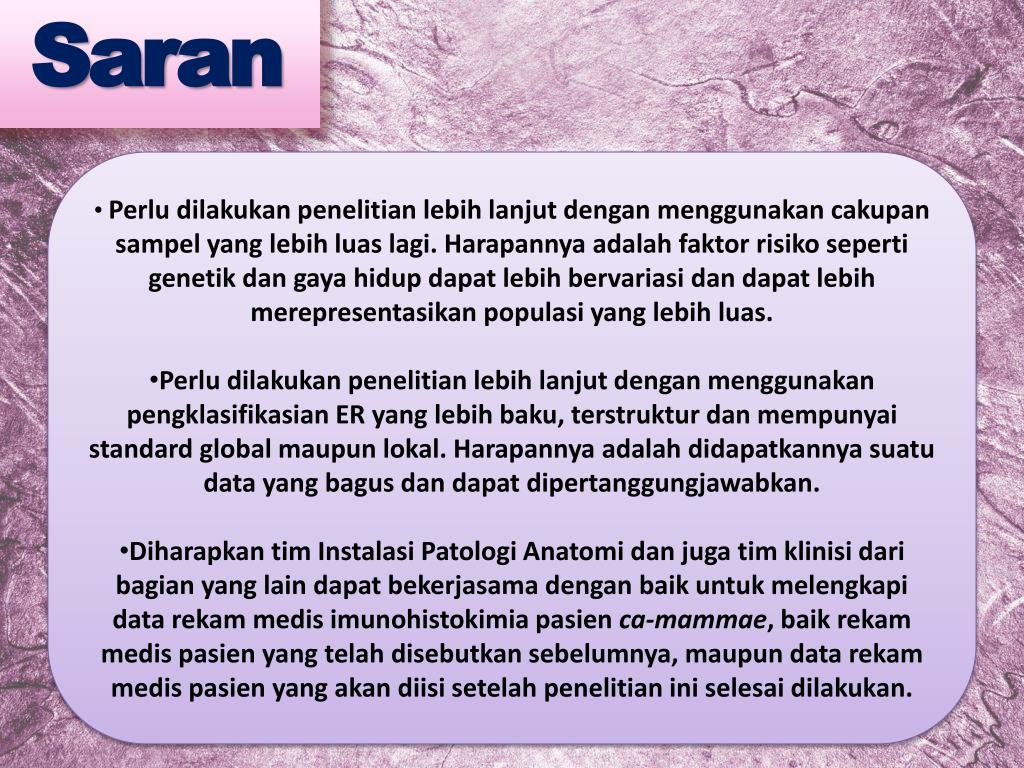 Saran • Perludilakukanpenelitianlebihlanjutdenganmenggunakancakupansampel yang lebihluaslagi. Harapannyaadalahfaktorrisikosepertigenetikdangayahidupdapatlebihbervariasidandapatlebihmerepresentasikanpopulasi yang lebihluas. • Perludilakukanpenelitianlebihlanjutdenganmenggunakanpengklasifikasian ER yang lebihbaku, terstrukturdanmempunyai standard global maupunlokal. Harapannyaadalahdidapatkannyasuatu data yang bagusdandapatdipertanggungjawabkan. • DiharapkantimInstalasiPatologiAnatomidanjugatimklinisidaribagian yang lain dapatbekerjasamadenganbaikuntukmelengkapi data rekammedisimunohistokimiapasienca-mammae, baikrekammedispasien yang telahdisebutkansebelumnya, maupun data rekammedispasien yang akandiisisetelahpenelitianiniselesaidilakukan.