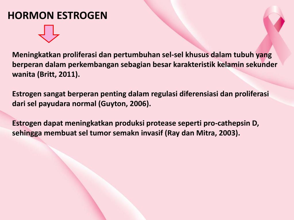 HORMON ESTROGEN Meningkatkan proliferasi dan pertumbuhan sel-sel khusus dalam tubuh yang berperan dalam perkembangan sebagian besar karakteristik kelamin sekunder wanita (Britt, 2011). Estrogen sangat berperan penting dalam regulasi diferensiasi dan proliferasi dari sel payudara normal (Guyton, 2006). Estrogen dapat meningkatkan produksi protease seperti pro-cathepsin D, sehingga membuat sel tumor semakn invasif (Ray dan Mitra, 2003).