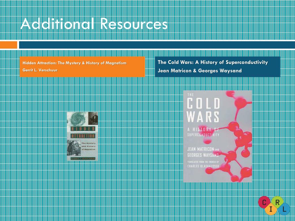 Additional Resources Hidden Attraction: The Mystery & History of Magnetism Gerrit L. Verschuur The Cold Wars: A History of Superconductivity Jean Matricon & Georges Waysand