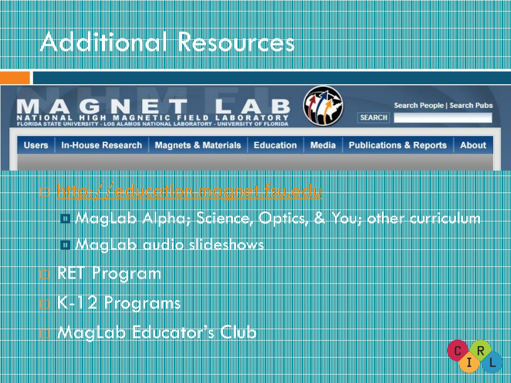 Additional Resources • http://education.magnet.fsu.edu • MagLabAlpha; Science, Optics, & You; other curriculum • MagLab audio slideshows • RET Program • K-12 Programs • MagLab Educator’s Club