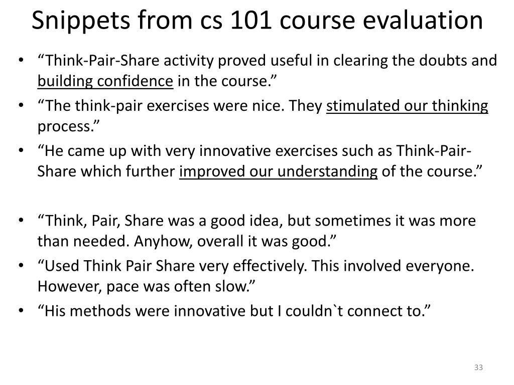 Snippets from cs 101 course evaluation • “Think-Pair-Share activity proved useful in clearing the doubts and building confidence in the course.” • “The think-pair exercises were nice. They stimulated our thinking process.” • “He came up with very innovative exercises such as Think-Pair-Share which further improved our understanding of the course.” • “Think, Pair, Share was a good idea, but sometimes it was more than needed. Anyhow, overall it was good.” • “Used Think Pair Share very effectively. This involved everyone. However, pace was often slow.” • “His methods were innovative but I couldn`t connect to.”