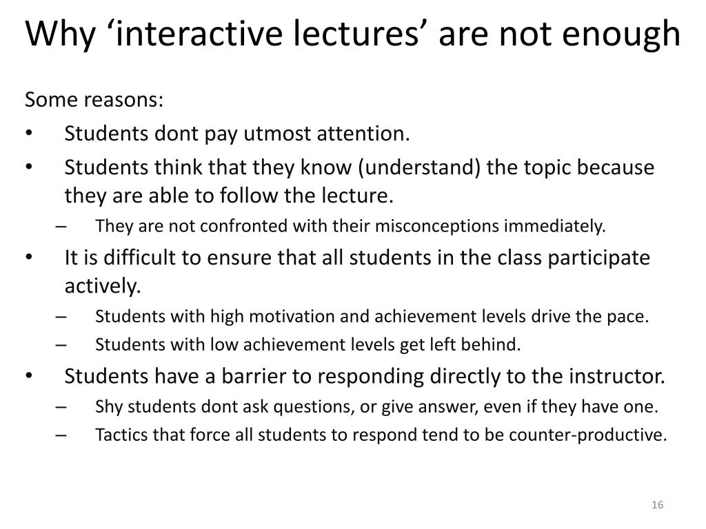Why ‘interactive lectures’ are not enough Some reasons: • Students dont pay utmost attention. • Students think that they know (understand) the topic because they are able to follow the lecture. • They are not confronted with their misconceptions immediately. • It is difficult to ensure that all students in the class participate actively. • Students with high motivation and achievement levels drive the pace. • Students with low achievement levels get left behind. • Students have a barrier to responding directly to the instructor. • Shy students dont ask questions, or give answer, even if they have one. • Tactics that force all students to respond tend to be counter-productive.