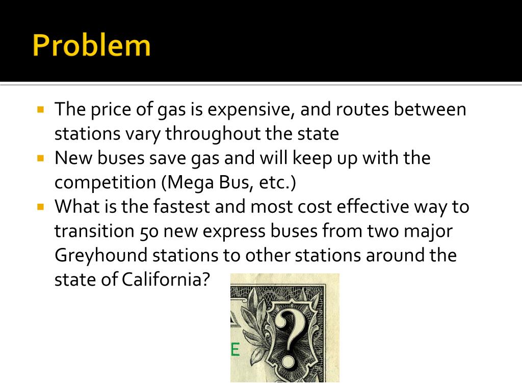 Problem • The price of gas is expensive, and routes between stations vary throughout the state • New buses save gas and will keep up with the competition (Mega Bus, etc.) • What is the fastest and most cost effective way to transition 50 new express buses from two major Greyhound stations to other stations around the state of California?