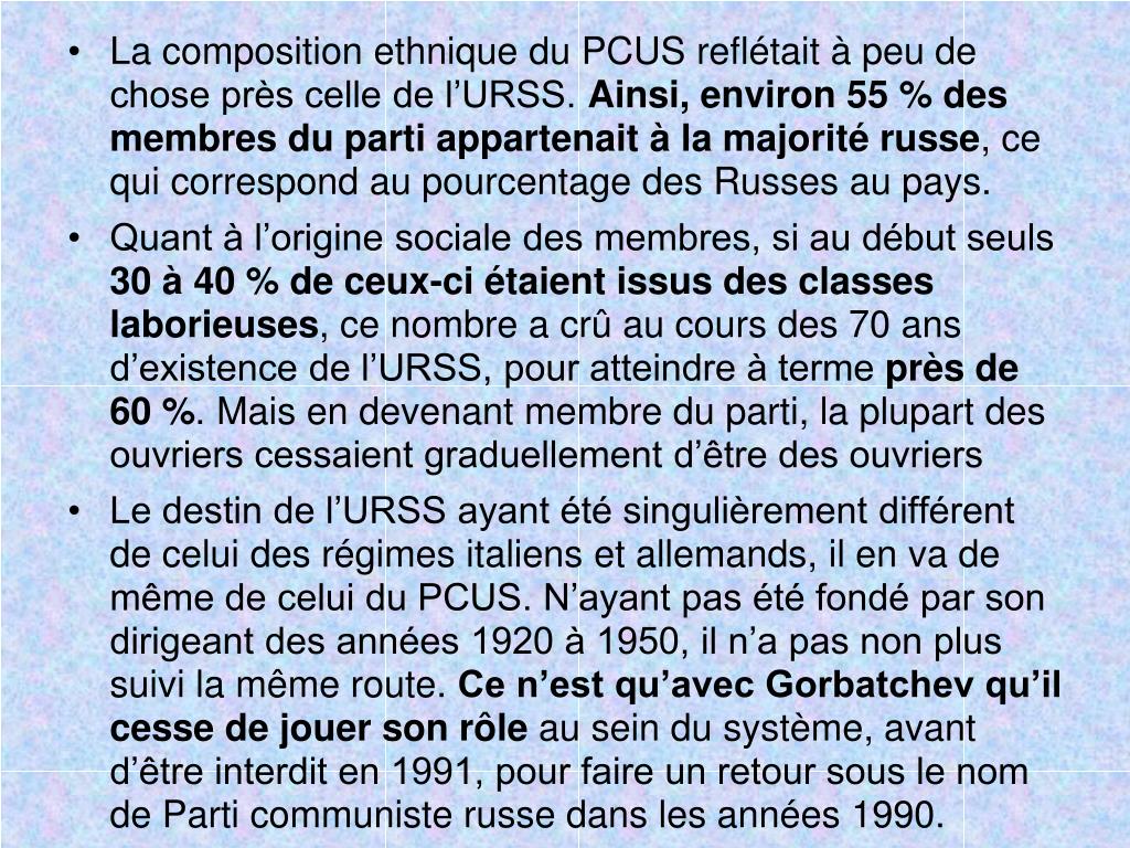 La composition ethnique du PCUS reflétait à peu de chose près celle de l’URSS. Ainsi, environ 55 % des membres du parti appartenait à la majorité russe, ce qui correspond au pourcentage des Russes au pays. • Quant à l’origine sociale des membres, si au début seuls 30 à 40 % de ceux-ci étaient issus des classes laborieuses, ce nombre a crû au cours des 70 ans d’existence de l’URSS, pour atteindre à terme près de 60 %. Mais en devenant membre du parti, la plupart des ouvriers cessaient graduellement d’être des ouvriers • Le destin de l’URSS ayant été singulièrement différent de celui des régimes italiens et allemands, il en va de même de celui du PCUS. N’ayant pas été fondé par son dirigeant des années 1920 à 1950, il n’a pas non plus suivi la même route. Ce n’est qu’avec Gorbatchev qu’il cesse de jouer son rôle au sein du système, avant d’être interdit en 1991, pour faire un retour sous le nom de Parti communiste russe dans les années 1990.