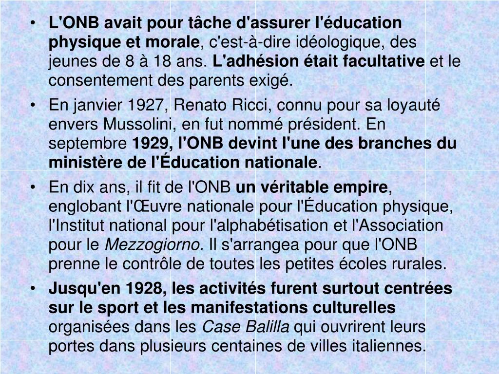 L'ONB avait pour tâche d'assurer l'éducation physique et morale, c'est-à-dire idéologique, des jeunes de 8 à 18 ans. L'adhésion était facultative et le consentement des parents exigé. • En janvier 1927, Renato Ricci, connu pour sa loyauté envers Mussolini, en fut nommé président. En septembre 1929, l'ONB devint l'une des branches du ministère de l'Éducation nationale. • En dix ans, il fit de l'ONB un véritable empire, englobant l'Œuvre nationale pour l'Éducation physique, l'Institut national pour l'alphabétisation et l'Association pour le Mezzogiorno. Il s'arrangea pour que l'ONB prenne le contrôle de toutes les petites écoles rurales. • Jusqu'en 1928, les activités furent surtout centrées sur le sport et les manifestations culturelles organisées dans les Case Balilla qui ouvrirent leurs portes dans plusieurs centaines de villes italiennes.