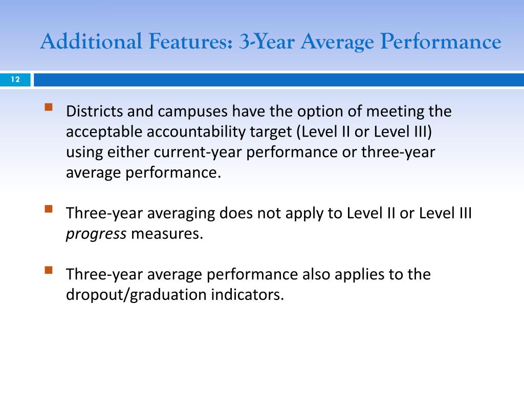 Additional Features: 3-Year Average Performance • Districts and campuses have the option of meeting the acceptable accountability target (Level II or Level III) using either current-year performance or three-year average performance. • Three-year averaging does not apply to Level II or Level III progress measures. • Three-year average performance also applies to the dropout/graduation indicators.