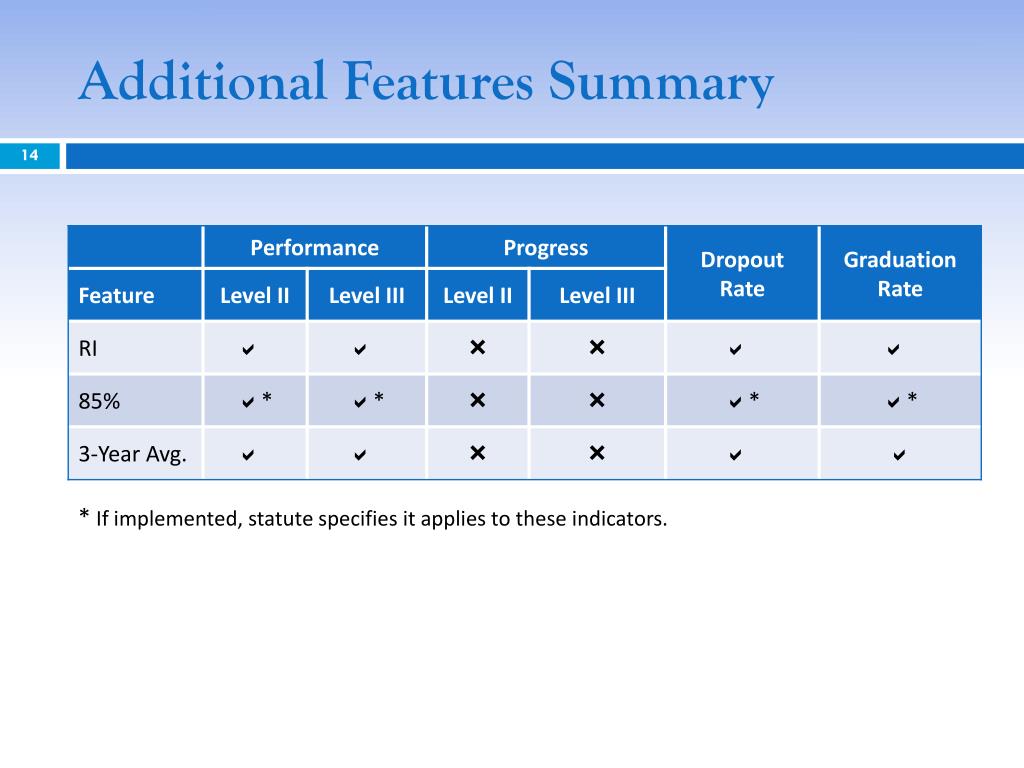 Additional Features Summary * If implemented, statute specifies it applies to these indicators.