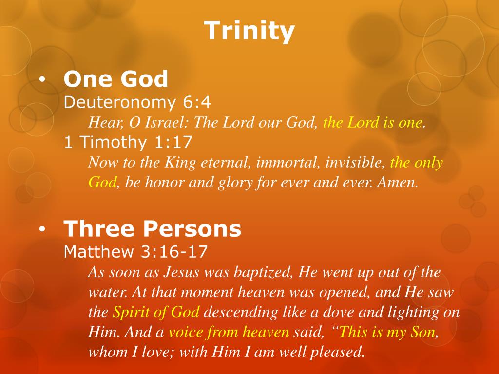 Trinity • One God • Deuteronomy 6:4 • Hear, O Israel: The Lord our God, the Lord is one. • 1 Timothy 1:17 • Now to the King eternal, immortal, invisible, the only God, be honor and glory for ever and ever. Amen. • Three Persons • Matthew 3:16-17 • As soon as Jesus was baptized, He went up out of the water. At that moment heaven was opened, and He saw the Spirit of God descending like a dove and lighting on Him. And a voice from heaven said, “This is my Son, whom I love; with Him I am well pleased.