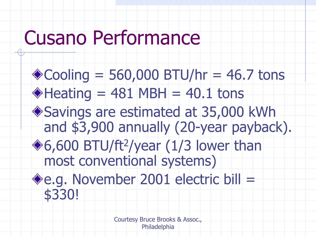 Cooling = 560,000 BTU/hr = 46.7 tons Heating = 481 MBH = 40.1 tons Savings are estimated at 35,000 kWh and $3,900 annually (20-year payback). 6,600 BTU/ft2/year (1/3 lower than most conventional systems) e.g. November 2001 electric bill = $330! Cusano Performance Courtesy Bruce Brooks & Assoc., Philadelphia