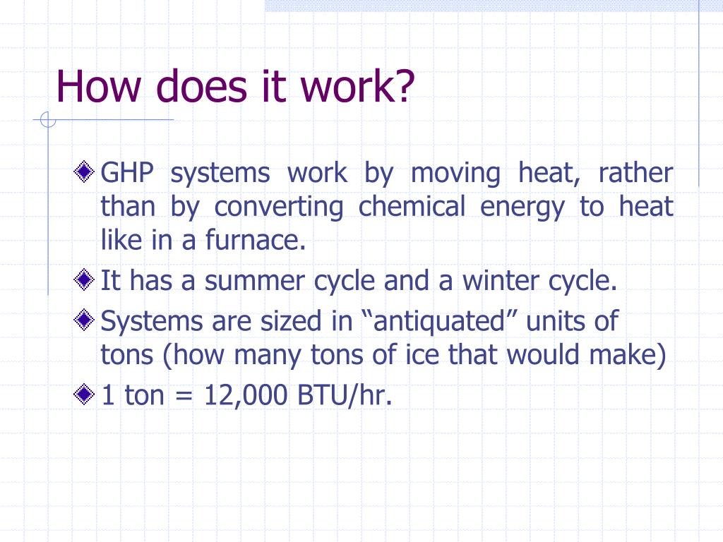 How does it work? • GHP systems work by moving heat, rather than by converting chemical energy to heat like in a furnace. • It has a summer cycle and a winter cycle. • Systems are sized in “antiquated” units of tons (how many tons of ice that would make) • 1 ton = 12,000 BTU/hr.
