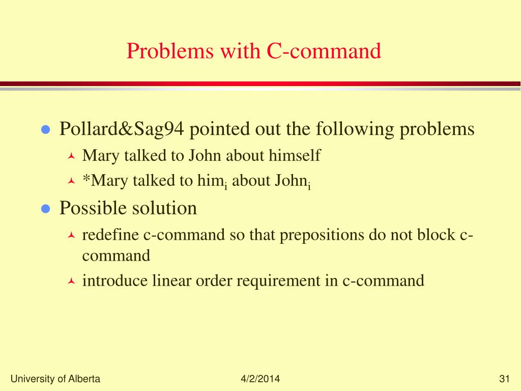 Problems with C-command • Pollard&Sag94 pointed out the following problems • Mary talked to John about himself • *Mary talked to himi about Johni • Possible solution • redefine c-command so that prepositions do not block c-command • introduce linear order requirement in c-command