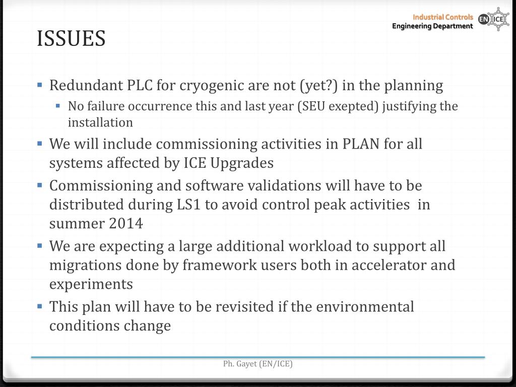 ISSUES • Redundant PLC for cryogenic are not (yet?) in the planning • No failure occurrencethis and last year (SEU exepted) justifyingthe installation • Wewillincludecommissioningactivitiesin PLAN for all systemsaffected by ICE Upgrades • Commissioning and software validations will have to bedistributedduring LS1 to avoid control peakactivities in summer 2014 • We are expecting a large additional workload to support all migrations done by framework users both in accelerator and experiments • This plan will have to berevisited if the environmentalconditions change Ph. Gayet (EN/ICE)