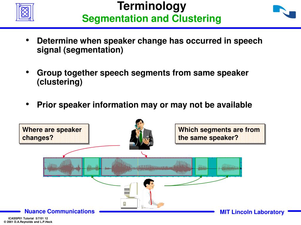 Terminology Segmentation and Clustering • Determine when speaker change has occurred in speech signal (segmentation) • Group together speech segments from same speaker (clustering) • Prior speaker information may or may not be available Where are speaker changes? Which segments are from the same speaker? Speaker A Speaker B