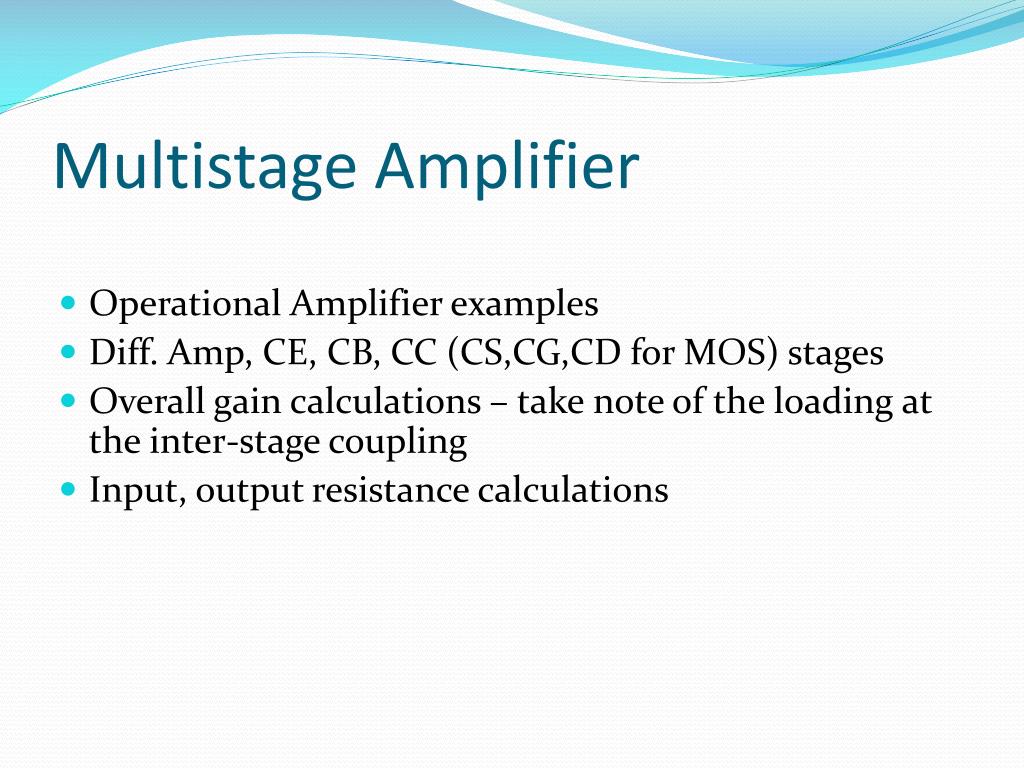 Multistage Amplifier • Operational Amplifier examples • Diff. Amp, CE, CB, CC (CS,CG,CD for MOS) stages • Overall gain calculations – take note of the loading at the inter-stage coupling • Input, output resistance calculations