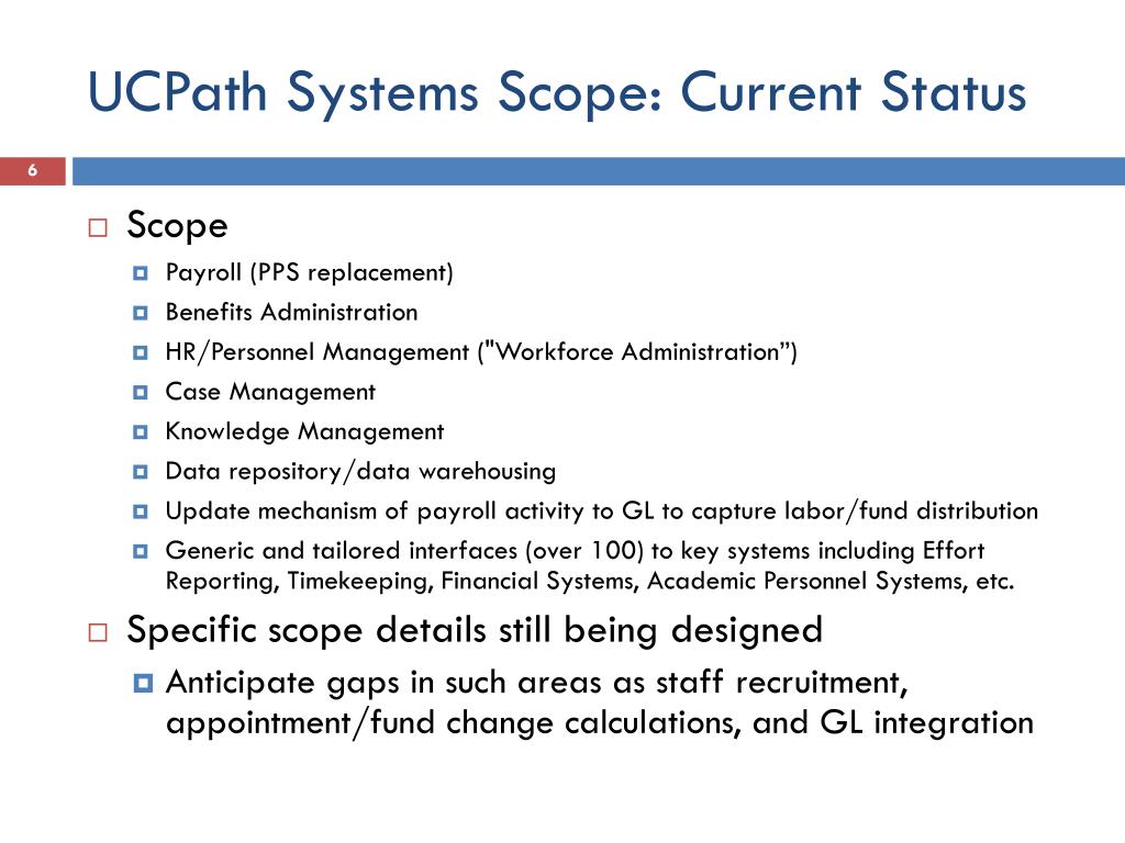 UCPath Systems Scope: Current Status • Scope • Payroll (PPS replacement) • Benefits Administration • HR/Personnel Management ("Workforce Administration”) • Case Management • Knowledge Management • Data repository/data warehousing • Update mechanism of payroll activity to GL to capture labor/fund distribution • Generic and tailored interfaces (over 100) to key systems including Effort Reporting, Timekeeping, Financial Systems, Academic Personnel Systems, etc. • Specific scope details still being designed • Anticipate gaps in such areas as staff recruitment, appointment/fund change calculations, and GL integration