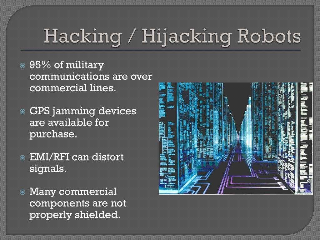 Hacking / Hijacking Robots • 95% of military communications are over commercial lines. • GPS jamming devices are available for purchase. • EMI/RFI can distort signals. • Many commercial components are not properly shielded.