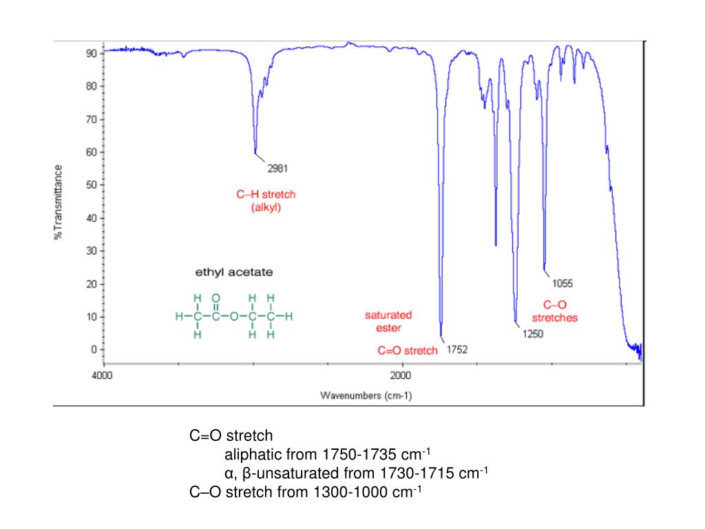 C=O stretch • aliphatic from 1750-1735 cm-1 • α, β-unsaturated from 1730-1715 cm-1 • C–O stretch from 1300-1000 cm-1