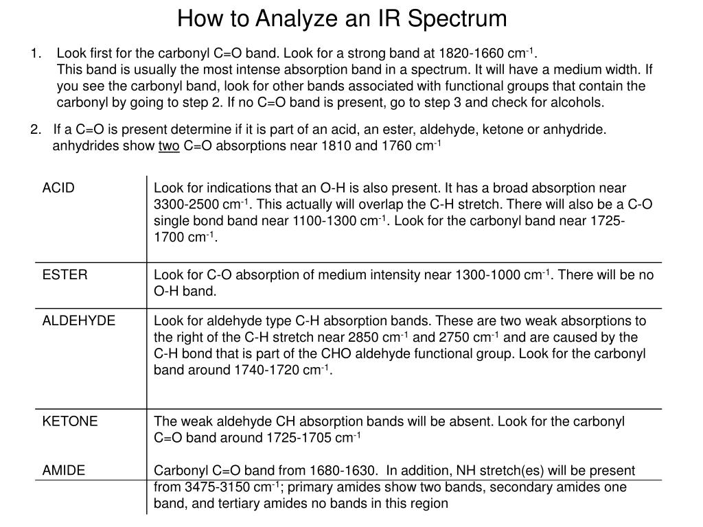2. If a C::O is present you want to determine if it is part of an acid, an ester, or an aldehyde or ketone. At this time you may not be able to distinguish aldehyde from ketone and you will not be asked to do so. How to Analyze an IR Spectrum • Look first for the carbonyl C=O band. Look for a strong band at 1820-1660 cm-1. • This band is usually the most intense absorption band in a spectrum. It will have a medium width. If you see the carbonyl band, look for other bands associated with functional groups that contain the carbonyl by going to step 2. If no C=O band is present, go to step 3 and check for alcohols. 2. If a C=O is present determine if it is part of an acid, an ester, aldehyde, ketone or anhydride. anhydrides show two C=O absorptions near 1810 and 1760 cm-1