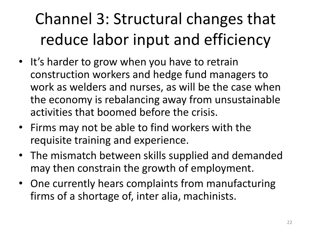 Channel 3: Structural changes that reduce labor input and efficiency • It’s harder to grow when you have to retrain construction workers and hedge fund managers to work as welders and nurses, as will be the case when the economy is rebalancing away from unsustainable activities that boomed before the crisis. • Firms may not be able to find workers with the requisite training and experience. • The mismatch between skills supplied and demanded may then constrain the growth of employment. • One currently hears complaints from manufacturing firms of a shortage of, inter alia, machinists.