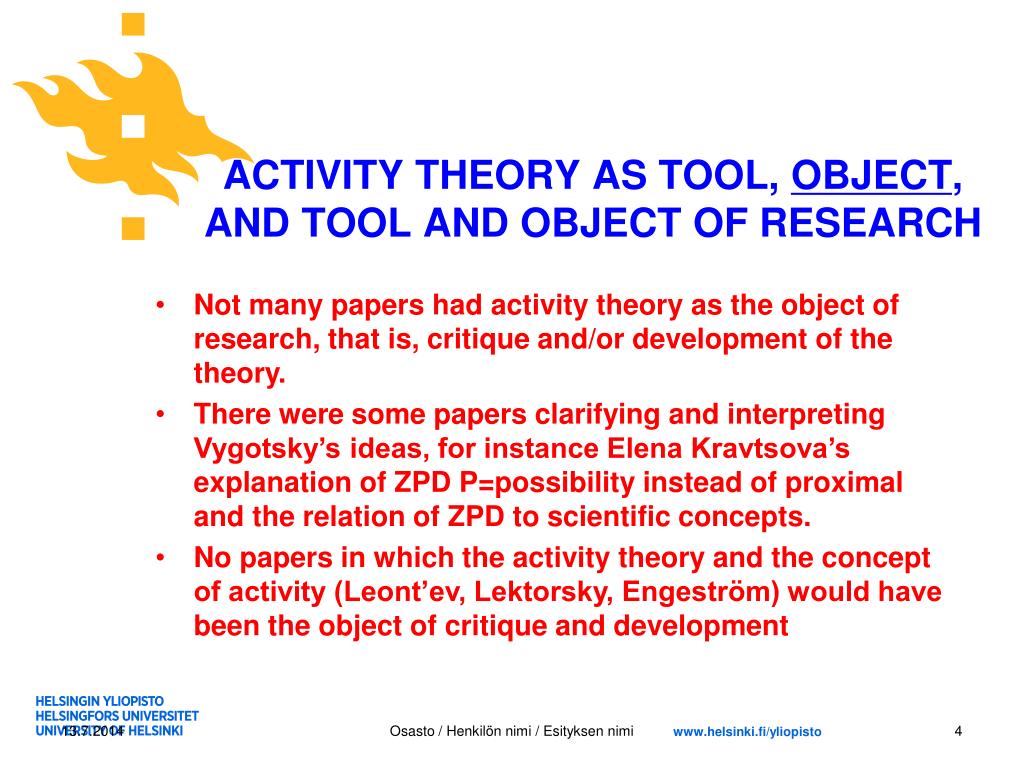 ACTIVITY THEORY AS TOOL, OBJECT, AND TOOL AND OBJECT OF RESEARCH • Not many papers had activity theory as the object of research, that is, critique and/or development of the theory. • There were some papers clarifying and interpreting Vygotsky’s ideas, for instance Elena Kravtsova’s explanation of ZPD P=possibility instead of proximal and the relation of ZPD to scientific concepts. • No papers in which the activity theory and the concept of activity (Leont’ev, Lektorsky, Engeström) would have been the object of critique and development Osasto / Henkilön nimi / Esityksen nimi