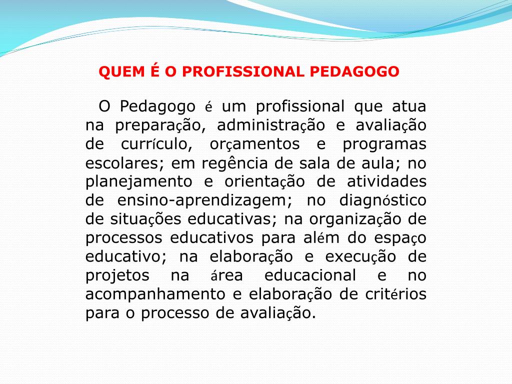 QUEM É O PROFISSIONAL PEDAGOGO • O Pedagogo é um profissional que atua na preparação, administração e avaliação de currículo, orçamentos e programas escolares; em regência de sala de aula; no planejamento e orientação de atividades de ensino-aprendizagem; no diagnóstico de situações educativas; na organização de processos educativos para além do espaço educativo; na elaboração e execução de projetos na área educacional e no acompanhamento e elaboração de critérios para o processo de avaliação.