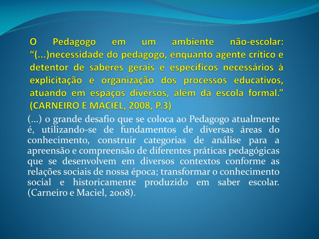 O Pedagogo em um ambiente não-escolar: “(...)necessidade do pedagogo, enquanto agente crítico e detentor de saberes gerais e específicos necessários à explicitação e organização dos processos educativos, atuando em espaços diversos, além da escola formal.” (CARNEIRO E MACIEL, 2008, P.3) (...) o grande desafio que se coloca ao Pedagogo atualmente é, utilizando-se de fundamentos de diversas áreas do conhecimento, construir categorias de análise para a apreensão e compreensão de diferentes práticas pedagógicas que se desenvolvem em diversos contextos conforme as relações sociais de nossa época; transformar o conhecimento social e historicamente produzido em saber escolar. (Carneiro e Maciel, 2008).