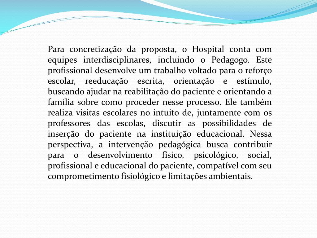 Para concretização da proposta, o Hospital conta com equipes interdisciplinares, incluindo o Pedagogo. Este profissional desenvolve um trabalho voltado para o reforço escolar, reeducação escrita, orientação e estímulo, buscando ajudar na reabilitação do paciente e orientando a família sobre como proceder nesse processo. Ele também realiza visitas escolares no intuito de, juntamente com os professores das escolas, discutir as possibilidades de inserção do paciente na instituição educacional. Nessa perspectiva, a intervenção pedagógica busca contribuir para o desenvolvimento físico, psicológico, social, profissional e educacional do paciente, compatível com seu comprometimento fisiológico e limitações ambientais.
